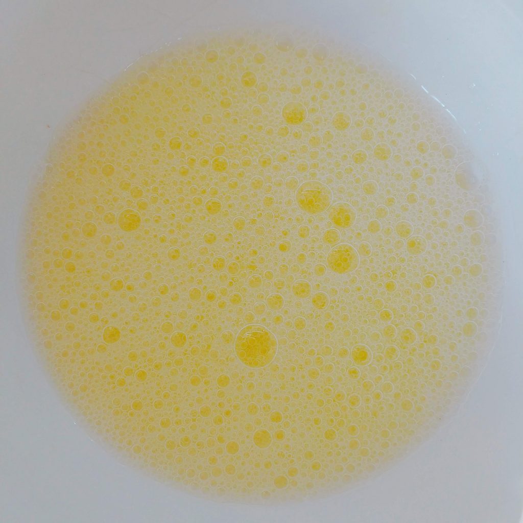 - Dans un autre saladier, verser le sucre puis le mélanger énergiquement avec les jaunes d’œufs (réserver les blancs). Ajouter le beurre fondu puis le mélange farine + levure. Mélanger de manière à obtenir une pâte homogène.