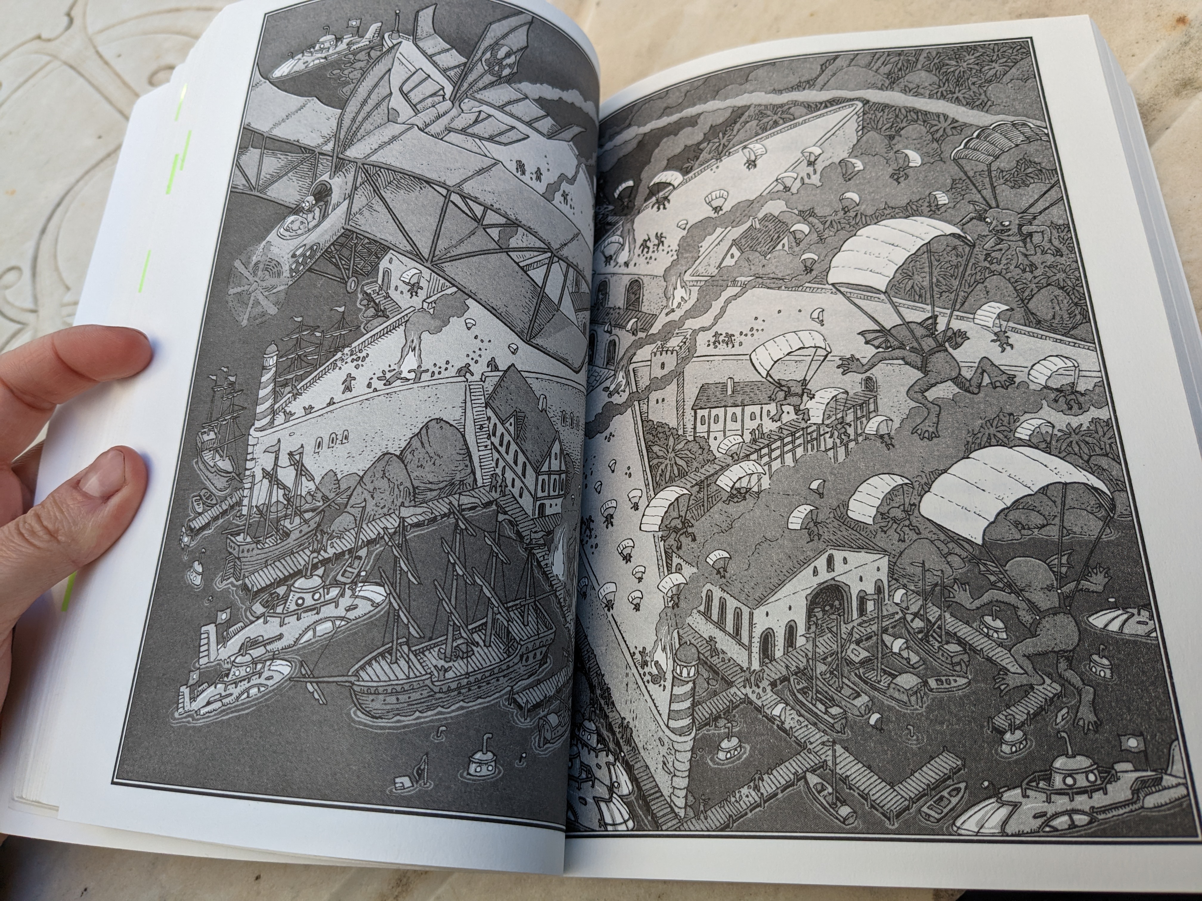 Il y a quelques illustrations dans le roman, hier j’ai croisé celle-ci, où des gremlins attaquent la base nautique en parachute. Si j’avais su qu’il y avait des gremlins dans ce roman, j’aurais eu encore plus envie de le lire !